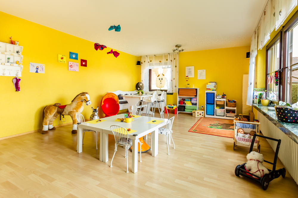 Die Räume sind über einen separaten Eingang zu erreichen. Sowohl der große Spielraum, als auch der Schlafraum haben eine Verbindungstür zum großen Garten und sind kindersicher ausgestattet.
